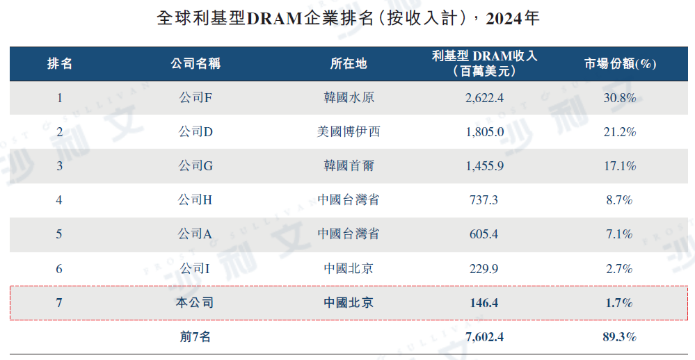 在利基型DRAM領域,公司排名全球第七、中國內地第二,全球市場份額為1.7%;