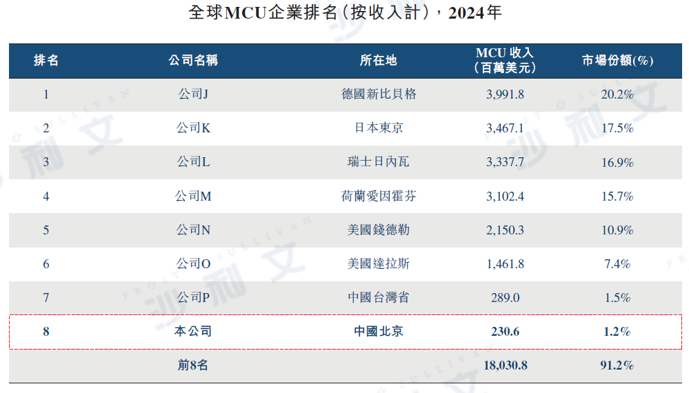 在MCU領域,公司排名全球第八、中國內地第一,全球市場份額為1.2%;