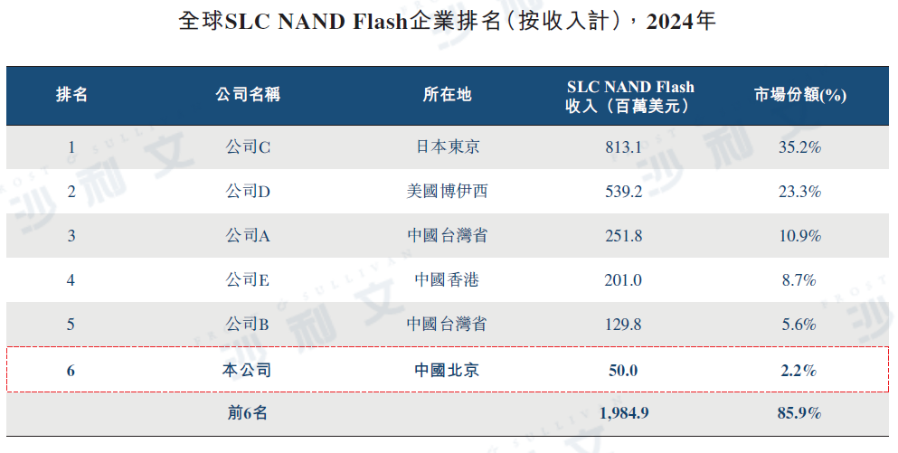 2024 年,全球 SLC NAND Flash 的市場份額高度集中于海外及中國臺灣地區廠商,前三大企業共占市場總值的 69.4%。本公司憑借約 0.5 億美元的業務收入位列全球 SLC NAND Flash 市場第六,也是排名最高的中國內地企業。除本公司外,SLC NAND Flash 領域的主要市場參與者還包括鎧俠株式會社、美光科技公司及華邦電子股份有限公司。