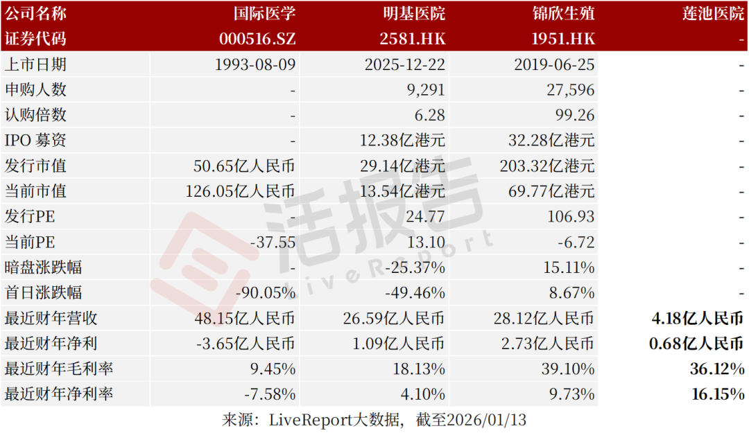 2026年1月13日,蓮池醫院首次向港交所遞交招股書,擬在香港主板上市,獨家保薦人為中國銀河國際。公司是中國特色精品專科醫療集團,2024年收入4.18億元人民幣,凈利潤0.68億元,毛利率36.12%;2025年前9個月收入3.59億元,同比增長兩成,凈利潤0.56億元,毛利率35.59%。LiveReport獲悉,蓮池醫院集團股份有限公司Lianchi Hospital Group Co., Ltd.(簡稱“蓮池醫院”)于2026年1月13日首次在港交所遞交上市申請,擬在香港主板上市。公司是一家中國特色精品專科醫療集團,堅守“專業創造卓越、愛心締造永恒”的文化理念及人本位的理念,將每位患者與客戶的安全、療效和感受置于公司工作的核心。截至2025年9月30日,公司按集團化管理結構運營5家醫院及一家養老機構。自成立以來,公司積極響應“健康中國”的國家戰略,形成了擁有無痛管理、快速康復(“ERAS”)、醫護康麻一體化、無陪護護理等特色醫療服務模式的知名醫療品牌——“蓮池醫療”。根據弗若斯特沙利文的資料,公司已成為中國極具影響力的醫療集團。截至2025年9月30日,公司的醫院總建筑面積合計約117893.06平方米,總注冊床位數786張,擁有341人的執業醫師及執業助理醫生團隊。根據弗若斯特沙利文的資料,按2024年私立醫院保膝手術量計,公司的淄博蓮池骨科醫院在山東省內位居首位,在全國位居第三。按2024年的收入計,公司的重慶長城骨科醫院在中國西南民營骨科專科醫院中位居首位。公司醫院的醫療專業團隊包括執業醫師(包括全職及多院執業醫師)、執業助理醫師、執業護士及其他醫療專業人員,如藥師、康復治療師、實驗室工作人員、放射技師及其他醫療輔助人員。截至2025年9月30日,公司的醫院組合包括:(i)淄博蓮池醫院、青島蓮池婦嬰醫院及合肥新海婦產醫院(公司于2024年7月1日收購并合并該醫院),主要提供婦嬰相關醫療服務;(ii)淄博蓮池骨科醫院,作為公司的全國學術總部及專科機構,專精復雜脊柱、關節置換與微創骨科手術;以及公司于2025年8月31日收購并合并的、位于中國西南地區的重慶長城骨科醫院,旨在為重慶都會區提供同等高標準的快速康復骨科及多學科診療服務。此外,公司于2025年8月在淄博啟動養老機構蓮慈醫養的運營,提供養老服務。公司專科醫療集團內的所有醫院都具有獨特的競爭力,并在各自區域享有突出的市場地位:淄博蓮池醫院是二級甲等醫院,是“山東省健康教育基地認定”“淄博市優生優育指導中心”及淄博市“有愛・有家・有蓮池”十佳服務品牌。青島蓮池婦嬰醫院于2017年通過國際JCI評審認證,是青島市第一家國際JCI認證民營醫院,是青島婦女兒童醫院醫聯體。淄博蓮池骨科醫院參照適用于三級醫院的床位、建筑面積及科室設置要求設立,是北京積水潭醫院(國家骨科醫學中心)聯合授予的保膝聯盟規范化中心單位,山東省立醫院脊柱外科聯盟單位,同時是北京積水潭骨科康復聯盟單位。重慶長城骨科醫院,為三級專科醫院,獲認可國家高新技術企業。重慶長城骨科醫院的顯微外科與護理專科是重慶市九龍坡區重點專科。根據弗若斯特沙利文的資料,按2024年的收入計,重慶長城骨科醫院在中國西南民營骨科專科醫院中位居首位。截至2024年12月31日止2個年度、2024年及2025年前9個月:收入分別約為人民幣3.56億、4.18億、2.98億、3.59億,2025年前9個月同比+20.34%;毛利分別約為人民幣1.17億、1.51億、1.04億、1.28億,2025年前9個月同比+22.45%;凈利分別約為人民幣0.57億、0.68億、0.47億、0.56億,2025年前9個月同比+17.68%;毛利率分別約為32.89%、36.12%、34.98%、35.59%;凈利率分別約為15.92%、16.15%、15.83%、15.48%。公司過去兩年業績穩步增長,盈利水平持續向好。2023年實現營業收入3.56億元、毛利1.17億元、凈利潤0.57億元;2024年營業收入增至4.18億元,毛利提升至1.51億元,凈利潤增長至0.68億元,得益于醫院網絡擴張及核心專科服務能力的提升,整體經營穩健發展。公司收入主要來自醫療服務業務,重大部分來自婦嬰相關醫療服務和骨科服務,2023年和2024年兩者合計占總營收比例超87%,其中婦嬰相關服務涵蓋產科、婦科、兒科等細分領域,是核心收入來源;其他醫療服務占比適中;銷售保健產品、提供養老服務及管理咨詢服務等其他業務獲得的收入比例最小,屬于補充性收入來源。根據弗若斯特沙利文(Frost & Sullivan)的報告,2019年中國骨科專科醫院市場規模約為人民幣192億元,2023年增長至約人民幣277億元,2019年至2023年復合年增長率為9.5%。預計2030年有望達到約人民幣579億元,2024年至2030年復合年增長率達11.0%。以2024年醫院收益為基準,重慶長城骨科醫院位居西南地區民營骨科專科醫院收益榜首。以2024年膝關節保留手術量為計,淄博蓮池骨科醫院在中國頭部醫院中排名第三。同行業IPO可比公司:國際醫學(000516.SZ)、明基醫院(2581.HK)、錦欣生殖(1951.HK)蓮池醫院的董事會由七名董事組成,包括四名執行董事及三名獨立非執行董事。陳志強先生、陳凱先生通過中雅投資持股46.86%,其中陳志強先生持有中雅投資90%股權,陳凱先生持有中雅投資10%股權;據LiveReport大數據統計,蓮池醫院中介團隊共計8家,其中保薦人1家,近10家保薦項目數據表現尚可;公司律師共計2家,綜合項目數據表現有待提升。整體而言中介團隊歷史數據表現平穩。