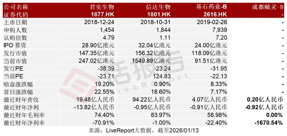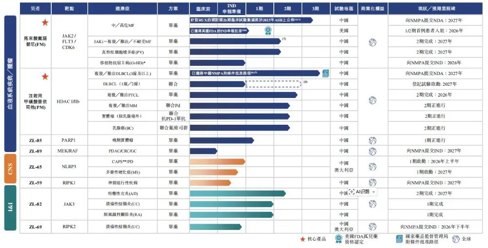 2026年1月13日,成都賾靈-B首次向港交所遞交招股書,擬在香港主板上市,聯席保薦人為Jefferies和中金。公司是臨床后期階段生物技術公司,2024年收入0.2億元,凈虧損0.92億元。2025年前9月收入7百萬元,凈虧損1.19億元,公司尚未商業化。公司成立于2019年,是一家臨床后期階段生物技術公司,致力于整合結構生物學、人工智能(“AI”)及臨床相關疾病模型,開發具有同類首創或同類最佳潛力的、高度差異化的小分子療法。公司致力于解決血液系統疾病、腫瘤、中樞神經系統(“CNS”)及免疫╱炎癥(“I&I”)疾病領域尚未被滿足的重大醫療需求。公司已經建立由八項專有資產組成的強大且多元化的管線,涵蓋臨床及臨床前階段。截至最后實際可行日期,公司的管線包括兩種核心產品,即馬來酸氟諾替尼(“FM”)及注射用甲磺酸普依司他(“PM”),另外兩種臨床階段候選藥物(即ZL-82及ZL-85)及四種臨床前階段候選藥物(即ZL-65、ZL-69、ZL-59及ZL-89)。其中,兩種候選藥物已進入3期注冊性臨床試驗階段,包括用于治療骨髓纖維化的FM及用于治療復發╱難治彌漫性大B細胞淋巴瘤(“復發╱難治 DLBCL”)的PM。馬來酸氟諾替尼(“FM”):FM目前正在推進3期注冊階段,是一款Janus激酶2(“JAK2”)、FMS樣酪氨酸激酶3(“FLT3”)及細胞周期蛋白依賴性激酶6(“CDK6”)的新型三靶點抑制劑,主要用于治療骨髓增生性腫瘤(“MPN”),包括骨髓纖維化及真性紅細胞增多癥(“PV”)。甲磺酸普依司他“(PM”):PM是一款處于3期注冊階段、針對復發╱難治DLBCL治療設計的高選擇性HDAC I/IIb類抑制劑。公司計劃于2027年向國家藥監局提交NDA,以申請針對復發╱難治DLBCL的附條件批準。截至2024年12月31日止1個年度、2024及2025年前9個月:收入分別約為人民幣0.20億、0.15億、0.07億,2024年同比-51.38%;研發分別約為人民幣-0.92億、-0.62億、-0.70億,2024年同比+13.67%;凈利分別約為人民幣-0.92億、-0.62億、-1.19億,2024年同比+93.48%;研發費用率分別約為467.40%、422.06%、986.87%。截至2025年9月30日,公司賬上現金約2.05億元,2025年前9月經營現金流約-0.84億元。君實生物(1877.HK)、信達生物(1801.HK)、基石藥業-B(2616.HK)公司的董事會由十一名董事組成,包括四名執行董事、三名非執行董事及四名獨立非執行董事。陳俐娟博士本身及通過眾信匯智、眾信恒生及眾信睿創合共持有公司25.6%股權。啟驥投資通過Qiming USD Funds持股7.2%;啟明資本旗下Qiming RMB Funds持股4.8%;公司上市前經歷了多輪融資,累計融資逾11.8億元人民幣。在2025年11月的C輪最新融資中,公司的投后估值約為34.1億人民幣。據LiveReport大數據統計,賾靈生物中介團隊共計8家,其中保薦人2家,近10家保薦項目數據表現普通;公司律師共計1家,綜合項目數據表現一般。整體而言中介團隊歷史數據表現中規中矩。