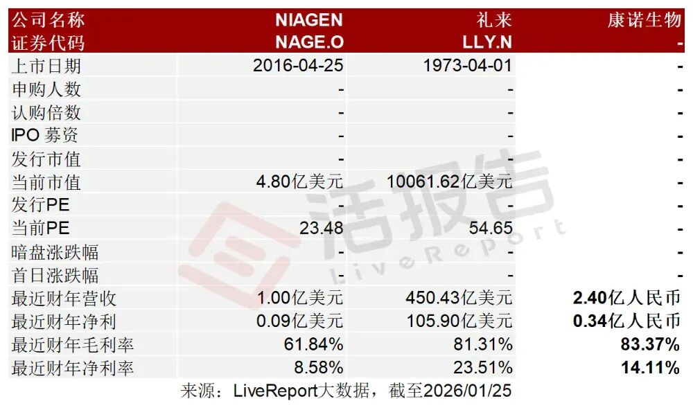 2026年1月25日,康諾生物首次向港交所遞交招股書,擬在香港主板上市,獨家保薦人為國投證券。公司是生物制藥企業,2024年收入2.40億元,凈利潤0.34億元,毛利率83.37%。2025年前9月收入2.38億元,凈利潤0.53億元,毛利率87.41%。公司是一家生物制藥企業,專注于線粒體醫學與健康產品的研發、藥物生產及商業化。公司專注于研究線粒體功能障礙引致的疾病,致力于將NAD+應用于心血管疾病、神經退化性疾病、生殖健康及衰老等領域的科學研究。公司以線粒體為核心,透過公司的“檢測—干預—評估—再干預”能力,結合AI驅動的評估與量化系統,提供衰老相關疾病解決方案。于往績期間,公司營銷及銷售了20項藥物,公司透過銷售該等藥物產生收益。截至最后可行日期,公司有2 0項藥物處于生產階段。公司的商業化藥物為旗艦線粒體藥物恩艾地®(注射用輔酶I)。根據弗若斯特沙利文,恩艾地®(注射用輔酶I)是國內研發且唯一全國和全球獲批的NAD+治療藥物。公司其他主要已商業化的藥物包括千容美®(注射用玻璃酸酶)、添舒®(注射用胰激肽原酶)及注射用硝普鈉。除上述四款主要藥物外,公司另外銷售16款仿制藥,涵蓋消化系統、呼吸系統、血液系統及神經系統四大治療領域。公司以線粒體醫學為核心,策略性地設計候選藥物。針對心力衰竭及卵巢功能衰退的KN-19ND-L1及KN-25ND-L1均已進入II期臨床研究。截至2024年12月31日止2個年度、2024及2025年前9個月:收入分別約為人民幣3.03億、2.40億、1.79億、2.38億,2025年前9月同比+33.19%;毛利分別約為人民幣2.64億、2.00億、1.50億、2.08億,2025年前9月同比+38.76%;凈利分別約為人民幣0.80億、0.34億、0.28億、0.53億,2025年前9月同比+92.51%;毛利率分別約為87.38%、83.37%、83.91%、87.41%;凈利率分別約為26.28%、14.11%、15.52%、22.43%。截至2025年11月30日,公司賬上現金約0.08億元,應收賬款約0.66億元,短期貸款0.15億元。2025年前9月公司的經營現金流約0.68億元。根據弗若斯特沙利文(Frost & Sullivan)的報告,中國線粒體醫學產品的市場規模由2020年的人民幣95億元增長至2024年的人民幣179億元,復合年增長率達17.1%。預計市場規模將于2035年達到人民幣3,081億元,2024至2035年的復合年增長率為29.5%。中國冠狀動脈疾病患病人數由2019年的25.3百萬增至2024年的28.0百萬,期內復合年增長率為2.6%。預計到2035年將達到35.3百萬,2024至2035年復合年增長率為2.1%。根據弗若斯特沙利文(Frost & Sullivan)的報告,恩艾地®是國內研發且唯一全國和全球獲批的NAD+治療藥物。NIAGENBIOSCIENCE(NAGE.O)、禮來(LLY.N)公司董事會由八名董事組成,包括四名執行董事、一名非執行董事及三名獨立非執行董事。公司由控股公司合肥鳳巢直接持股約74.7%,而合肥鳳巢則由執行董事、董事長兼行政總裁王偉先生直接擁有75%,由副董事長、執行董事兼董事會秘書林子榮先生持股12.5%,由黃金懿女士持股12.5%。合肥偉正(王偉先生為其唯一普通合伙人)持股9.3%,合肥國資控制的長豐產業投資持股6.7%。雇員激勵平臺合肥康民持股5.3%、合肥康虹持股1.4%、合肥康成持股1.1%、合肥康行持股0.9%、合肥康貝持股0.5%及合肥康眾持股0.1%。據LiveReport大數據統計,康諾生物中介團隊共計8家,其中保薦人1家,近10家保薦項目數據表現糟糕;公司律師共計2家,綜合項目數據表現穩妥。整體而言中介團隊歷史數據表現普通。