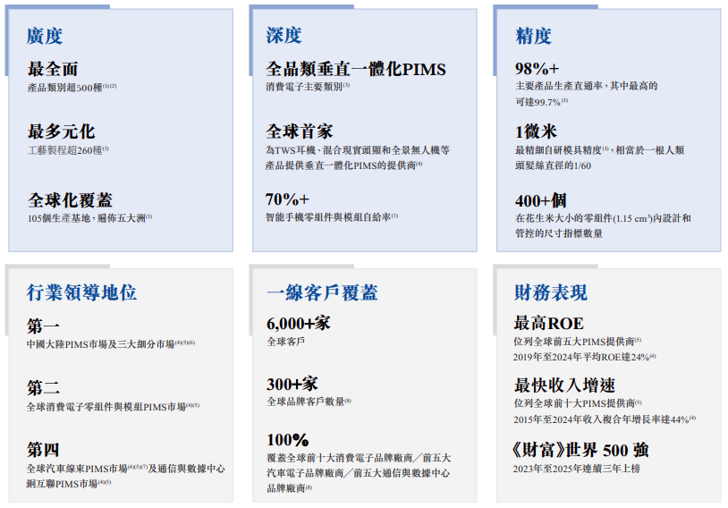 據弗若斯特沙利文(Frost & Sullivan)的資料,在2019年至2024年,全球精密智造解決方案(PIMS)市場的規模穩定增長,由人民幣69,465億元增加至人民幣90,169億元,復合年增長率達5.4%;預計將由2025年的人民幣94,691億元增加至2029年的人民幣121,827億元,即2025年-2029年復合年增長率為6.5%。根據2024年全球收入市場份額,公司位列全球PIMS提供商第4位,在總部位于中國大陸的企業中排名最高。董事會由八名董事組成,包括五名執行董事及三名獨立非執行董事。立訊有限(王女士及王先生各占50%)持股37.49%,王先生直接持股0.27%;