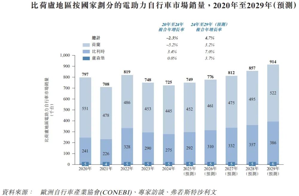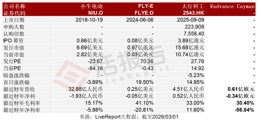 公司2024年收入0.61億歐元,凈虧損0.34億歐元,毛利率30.40%。2025年前9月收入0.54億歐元,凈虧損0.30億歐元,毛利率31.84%。公司報告期內虧損有所增加。公司是一家以歐洲為中心、創新驅動的電動出行企業,專注于提供電助力自行車產品,推動健康且可持續的生活方式。公司的產品涵蓋綜合品類的電助力自行車系列,包括城市型、混合型與運載型車款,并提供配件及服務。該多元產品組合滿足歐洲各地廣泛的應用場景,包括城市通勤、越野探險、家庭運輸及載貨。根據弗若斯特沙利文的資料,自創立以來,公司是歐洲電助力自行車產業中發展規模最快的企業。此外,在2022至2024年間,公司成為比荷盧地區電助力自行車銷量增長最迅速的品牌。按銷量計,公司亦于2024年在比荷盧地區城市通勤分部名列電助力自行車品牌前五。公司以單一、一貫品牌TENWAYS推廣電助力自行車產品,整合在線廣告、社交媒體、達人合作、贊助活動,以及行業展會、城市巡回推廣等實地活動。公司是歐洲首批推出整合力矩傳感器、輪轂電機與皮帶傳動的電助力自行車品牌之一。于往績記錄期間,公司的收入主要來自銷售電助力自行車產品,其次來自銷售配件、服飾及其他相關產品及服務。公司提供城市、混合及貨運三大類別的TENWAYS電助力自行車,每類皆針對特定消費者需求及使用場景而設計,例如城市通勤、休閑騎行及貨物運輸。截至2024年12月31日止2個年度、2024及2025年前9個月:收入分別約為歐元0.48億、0.61億、0.53億、0.54億,2025年前9月同比+3.07%;毛利分別約為歐元0.12億、0.18億、0.17億、0.17億,2025年前9月同比+4.10%;研發分別約為歐元-0.01億、-0.02億、-0.01億、-0.02億,2025年前9月同比+34.93%;凈利分別約為歐元-0.05億、-0.34億、-0.28億、-0.30億,2025年前9月同比+6.09%;毛利率分別約為25.77%、30.40%、31.52%、31.84%;研發費用率分別約為2.57%、2.81%、2.38%、3.11%;凈利率分別約為-9.69%、-56.84%、-53.79%、-55.37%。截至2025年9月30日,公司賬上現金約0.20億歐元,應收賬款約0.06億歐元,短期貸款0.11億歐元。2025年前9月經營現金流約0.02億歐元。根據弗若斯特沙利文(Frost & Sullivan)的報告,2020年至2024年期間,比荷盧地區電助力自行車市場經歷調整期,隨后逐步趨穩并恢復增長。總銷量由2020年的約797千臺降至2024年的約725千臺,復合年增長率約為-2.3%。展望未來,在置換需求復蘇及實用型應用場景持續擴大的支持下,比荷盧地區總銷量預計將于2029年增至約914千臺,2024年至2029年間的復合年增長率約為4.7%。于2024年,按城市電助力自行車的銷售量計,前五大電助力自行車品牌在比荷盧地區的合計銷量約為157.7千輛,約占該地區城市電助力自行車總銷量的47.9%。于2024年,按城市電助力自行車的銷售量計,公司品牌在比荷盧市場的電助力自行車品牌中位列第五,市場份額約為5.9%,而按電助力自行車銷量計,公司品牌為2022年至2024年期間在比荷盧地區增長最快的電助力自行車品牌。小牛電動(NIU.O)、FLY-E(FLYE.O)、大行科工(2543.HK)公司董事會將由八名董事組成,包括五名執行董事及三名獨立非執行董事。梁霄凌先生直接持股行使約16.85%的表決權,通過與管理層股東簽訂表決權代理協議行使約12.09%的表決權,并通過與Truewing Holding Limited、Numerator Holding Limited、Syu Ling Holding Limited簽訂一致行動協議行使約13.42%的表決權,梁先生合計能夠行使公司約42.38%的表決權。高瓴資本通過SHCJ Holdings及BJCZ Holdings持股約21.17%;公司上市前經歷了多輪融資,累計融資約4.77億元人民幣。在2024年1月的B+輪最新融資中,公司的投后估值約為17.4億人民幣。據LiveReport大數據統計,Radvance Cayman中介團隊共計9家,其中保薦人1家,近10家保薦項目數據表現良好;公司律師共計4家,綜合項目數據表現有待提升。整體而言中介團隊歷史數據表現尚可。(本文首發于活報告公眾號,ID:livereport)