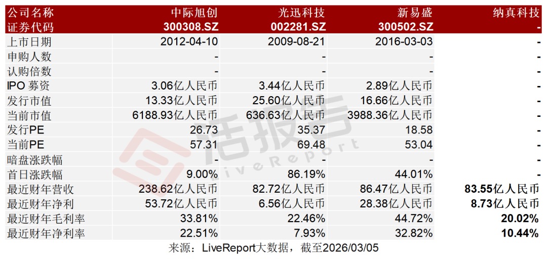2026年3月5日,納真科技第2次向港交所遞交招股書,擬在香港主板上市,聯席保薦人為花旗、中信證券。公司是全球領先的光通信與光連接解決方案全棧式供貨商,2024年收入50.87億元人民幣,凈利潤0.89億元,毛利率17.36%;2025年收入83.55億元,同比增長六成,凈利潤8.73億元,同比暴增八倍,毛利率20.02%。LiveReport獲悉,公司中文名英文名(簡稱“納真科技”)于2026年3月5日在港交所遞交上市申請,擬在香港主板上市。這是該公司第2次遞表,上一次是在2025年8月25日。公司是全球光通信與光連接產品供應商,產品包括(i)光模塊,(ii)光芯片,及(iii)光網絡終端。公司憑借在AI、云計算、FTTx、傳輸網絡和無線應用領域多品類優質產品的量產交付能力,廣泛賦能世界各地的云服務廠商、電信及網絡設備供應商與運營商。按全球光模塊收入計,公司在全球所有專業光模塊廠商中排名第五;按中國光模塊收入計,公司在全球所有專業光模塊廠商中排名第三;按全球光模塊收入計,公司在全球所有光模塊廠商中排名第七;按中國光模塊收入計,公司在全球所有光模塊廠商中排名第四;按全球數通光模塊收入計,在全球所有專業光模塊廠商中排名第五;按全球FTTx光模塊收入計,公司在全球所有專業光模塊廠商中排名第三;按中國光網絡終端盒子收入計,公司在全球所有專業光網絡終端盒子廠商中排名第三。截至最后實際可行日期,公司亦是全球少數同時擁有光模塊和光芯片研發及量產能力的企業之一。收入分別約為人民幣42.39億、50.87億、83.55億,2025年同比+64.25%;毛利分別約為人民幣8.74億、8.83億、16.72億,2025年同比+89.36%;凈利分別約為人民幣2.16億、0.89億、8.73億,2025年同比+875.13%;毛利率分別約為20.62%、17.36%、20.02%;凈利率分別約為5.08%、1.76%、10.44%。公司的收入主要來自光模塊業務,且占比持續擴大,2025年光模塊收入占總營收的78.2%,其中數通光模塊是核心增長引擎,2025年占比達65.5%,成為收入的最主要來源。根據弗若斯特沙利文(Frost & Sullivan)的報告,全球光模塊行業市場規模(按銷售收入計)從2020年的人民幣775億元增長至2024年的人民幣1267億元,復合年增長率為13.1%。預計至2029年,市場規模將達到人民幣2954億元,自2024年起的復合年增長率為18.5%。全球光芯片行業市場規模(按銷售收入計)從2020年的人民幣131億元增長至2024年的人民幣249億元,復合年增長率為17.4%。預計全球光芯片市場(按銷售收入計)將保持強勁增長勢頭,于2029年將達到人民幣665億元,自2024年起的復合年增長率為21.7%。光網絡終端盒子細分市場的全球市場規模(按銷售收入計)從2020年的人民幣336億元增長至2024年的人民幣443億元,復合年增長率為7.1%。預計全球光網絡終端盒子市場將保持上升趨勢,于2029年將達到人民幣718億元,自2024年起的復合年增長率為10.2%。按2024年全球光模塊收入計算,公司的全球銷售收入達人民幣37億元,在所有專業光模塊廠商中排名第五,占據全球光模塊行業2.9%的市場份額。按2024年中國光模塊銷售收入計,公司在中國市場的光模塊銷售收入達人民幣24億元,排名第三,市場份額為7.2%。同行業IPO可比公司:中際旭創(300308.SZ)、光迅科技(002282.SZ)、新易盛(300502.SZ)公司的董事會由九名董事組成,包括兩名執行董事、四名非執行董事及三名獨立非執行董事。海信集團控股直接或通過子公司世紀金隆間接持股48.61%,為公司控股股東;廈門實體(廈門國炬翔、廈門先進制造業基金及廈門火炬潤信)持股3.06%;AI Talents(七名個人股東,均為公司現有雇員)持股0.83%。公司上市前經歷了多輪融資,累計融資逾10.7億元人民幣。在2025年7月的最新融資中,公司的投后估值約為121.4億港元,每股概約成本為14.97港元。據LiveReport大數據統計,納真科技中介團隊共計14家,其中保薦人2家,近10家保薦項目數據表現不理想;公司律師共計7家,綜合項目數據表現中規中矩。整體而言中介團隊歷史數據表現尚可。