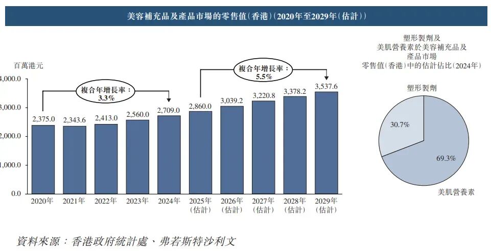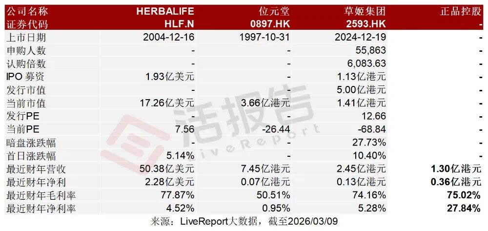 2026年3月9日,正品控股第2次向港交所遞交招股書,擬在香港主板上市,獨家保薦人為浤博資本。公司主要在香港從事保健及美容補充品與產品的開發、銷售、營銷及分銷。2024年收入1.1億元,凈利潤0.35億元,毛利率78.62%;2025年收入1.3億美元,凈利潤0.36億美元,毛利率75.02%。公司是在香港從事保健及美容補充品與產品的開發、銷售、營銷及分銷。公司將產品的生產外包給供應商(包括制造商)并主要透過萬寧在香港的零售門市以公司自有品牌及第三方品牌分銷公司的產品。根據弗若斯特沙利文的資料,按保健及美容補充品與產品的零售值計算,公司于2024年在香港所有國際及本地保健及美容補充品與產品供應商中的市場占有率約為1.6%。公司經營(i)合共六個自有品牌,即(a)“正品”;(b)“炎痛消”;(c)“Organicpharm”;(d)“日藥堂”;(e)“維再生”;及(f)“Profix”;及(ii)合共六個第三方品牌,包括(其中包括)(a)“iPro+”及(b)“Boiron”。公司的產品主要分為兩類:(i)保健補充品及產品;及(ii)美容補充品及產品公司的收益來自(i)銷售公司自有品牌及第三方品牌的保健及美容補充品與產品;(ii)向第三方品牌商或品牌商集團提供銷售推廣服務;及(iii)提供管理及包裝服務截至2025年3月31日止3個財年,2025及2026財年前6個月:收入分別約為人民幣0.43億、1.10億、1.30億、0.53億、0.52億,2026年前6月同比-1.03%;毛利分別約為人民幣0.35億、0.86億、0.98億、0.40億、0.40億,2026年前6月同比+1.12%;凈利分別約為人民幣0.11億、0.35億、0.36億、0.12億、0.01億,2026年前6月同比-92.10%;毛利率分別約為81.59%、78.62%、75.02%、75.00%、76.64%;凈利率分別約為26.19%、32.37%、27.84%、22.55%、1.80%。根據弗若斯特沙利文(Frost & Sullivan)的報告,香港美容補充品及產品市場于2020年錄得2,375.0百萬港元的銷售額,并于2024年增加至2,709.0百萬港元,復合年增長率約為3.3%。此韌性有賴于多項結構性因素。展望未來,預計于2029年之前該類別銷售額將達3,537.6百萬港元,意味著2025年至2029年期間的復合年增長率為5.5%。主要推動因素包括男士美容及體態塑形潮流興起,擴大脂肪代謝藥片及增肌酵素混合劑的適用客戶群;持續的網紅宣傳令用戶由外用護膚轉變為外用與口服并行的方案;以及肽類即飲劑、NMN混合劑及無糖軟糖等創新產品有助豐富產品種類。在美容補充品及產品市場中,就2024年零售值而言塑形制劑及美肌營養素的估計占比分別約為30.7%及69.3%。于2024年,按零售值計算,十大本地保健及美容補充品與產品供應商的市場占有率合共為31.1%。在本地市場參與者之中,按香港保健及美容補充品與產品零售值計算,公司排名第七,市場占有率為1.6%。公司的大部分產品乃透過萬寧的零售門市銷售及分銷,其為香港最大保健及美容產品連鎖零售商,于2026年2月,在香港及澳門分別擁有306間及20間門市,按2024年香港保健及美容補充品與產品零售總值計算,市場占有率約為34.4%。同行業IPO可比公司:HERBALIFE(HLF.N)、位元堂(0897.HK)、草姬集團(2593.HK)。公司董事會由五名董事組成,包括兩名執行董事及三名獨立非執行董事。主要控股股東為由張運裕先生控有的AlwaysSuccess持股約78.91%;燕女士持股約3.95%;周先生持股約3.45%;張先生持股約3.15%;勞先生持股約2.94%;劉先生持股約2.49%;歐陽女士持股約1.97%;周女士持股約1.78;交銀持股約1.36%。據LiveReport大數據統計,正品控股中介團隊共計8家,其中保薦人1家;公司律師共計3家,綜合項目數據表現不足。整體而言中介團隊歷史數據表現有待提升。(本文首發于活報告公眾號,ID:livereport)