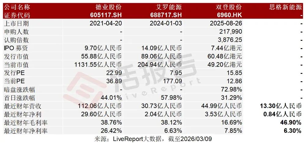 2026年3月9日,思格新能源第3次向港交所遞交招股書,擬在香港主板上市,聯席保薦人為中信、法國巴黎銀行。公司是分布式儲能系統(DESS)解決方案領域的全球領先者,2024年收入13.30億元,凈利潤0.84億元,毛利率46.90%。2025年前9月收入56.41億元,凈利潤18.90億元,毛利率51.63%。公司2024年開始扭虧為盈,2025年前三季度收入同比增長7倍。公司是分布式儲能系統(DESS)解決方案領域的全球領先者。據弗若斯特沙利文報告,于成立兩年后,按產品出貨量計,公司已成為全球排名第一的可堆棧分布式光儲一體機解決方案提供商,2024年的市場份額達28.6%,占同期分布式儲能系統市場的0.6%及儲能系統市場的0.2%。公司為家庭和企業開發及提供創新的可再生能源解決方案。截至最后實際可行日期,公司的產品主要用于住宅場景,且較少用于工商業及公用事業規模場景。公司的旗艦產品SigenStor 采用模塊化、可堆棧產品設計,將光伏逆變器、直流充電模塊、儲能變流器(PCS)、儲能電池和能源管理系統(EMS)無縫融合一體。于往績記錄期間,SigenStor的銷售額持續貢獻了公司總收入的逾90%。截至2025年9月30日,公司與逾80個國家和地區的161家分銷商建立了廣泛的合作網絡,并且公司已成為亞太、歐洲及非洲等所有主要市場中領先分銷商(包括澳大利亞、英國、愛爾蘭、瑞典、南非及美國的頭部分銷商)的首選合作伙伴。于2024年及截至2025年9月30日止九個月,公司的旗艦產品SigenStor 實現能源容量銷售總額分別為447兆瓦時及2,355兆瓦時。截至2024年12月31日止2個年度、2024及2025年前9個月:收入分別約為人民幣0.58億、13.30億、7.00億、56.41億,2025年前9月同比+706.11%;毛利分別約為人民幣0.18億、6.24億、3.10億、29.12億,2025年前9月同比+840.84%;凈利分別約為人民幣-3.73億、0.84億、-0.53億、18.90億,2025年前9月同比-3642.42%;毛利率分別約為31.30%、46.90%、44.24%、51.63%;凈利率分別約為-640.55%、6.30%、-7.62%、33.51%。截至2025年9月30日,公司賬上現金約14.46億元,應收賬款約23.20億元,短期貸款13.54億元,長期借款0.89億元。2025年前9月經營現金流約2.47億元。根據弗若斯特沙利文(Frost & Sullivan)的報告,2022年至2024年,全球可堆棧分布式光儲一體機解決方案的出貨量由0.1千兆瓦時增至1.7千兆瓦時。預計全球可堆棧分布式光儲一體機解決方案的出貨量于2030年達到47.9千兆瓦時,2025年至2030年的年復合增長率為65.8%。于2024年,前五大可堆棧分布式光儲一體機解決方案公司占全球總出貨量的78.9%。按2024年的出貨量計,公司為最大的可堆棧分布式光儲一體機解決方案公司,出貨量為475兆瓦時,市場份額為28.6%。德業股份(605117.SH)、艾羅能源(688717.SH)、雙登股份(6960.HK)公司董事會包括八名董事,由兩名執行董事、三名非執行董事及三名獨立非執行董事組成。許先生直接持股10.18%,通過控股實體間接持股約39.10%(上海鷗集持股6.43%、上海谷廩持股7.86%、上海麥廩持股21.07%、上海麥塔持股3.74%),合共持股約49.28%,是公司的控股股東。此外,張先生直接持股1.25%,通過上海千株松間接持股9.88%,合計持股11.13%。公司上市前經歷了多輪融資。在2024年1月的B1輪最新融資中,公司的投后估值約為41.7億人民幣。據LiveReport大數據統計,思格新能源中介團隊共計9家,其中保薦人2家,近10家保薦項目數據表現差強人意;公司律師共計2家,綜合項目數據表現不理想。整體而言中介團隊歷史數據表現有待提升。(本文首發于活報告公眾號,ID:livereport)