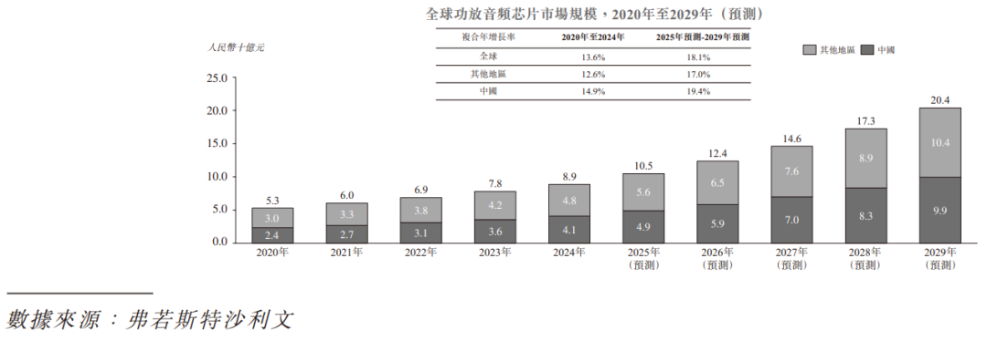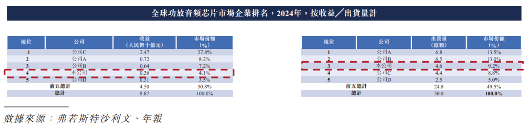公司是功放音頻芯片及觸覺反饋芯片的中國供應商。公司在無晶圓業務模式下專注于設計低功率音頻芯片、中大功率音頻芯片及觸覺反饋芯片,為新興應用場景提供廣泛的解決方案。根據弗若斯特沙利文報告,按2024年收益計算,公司: