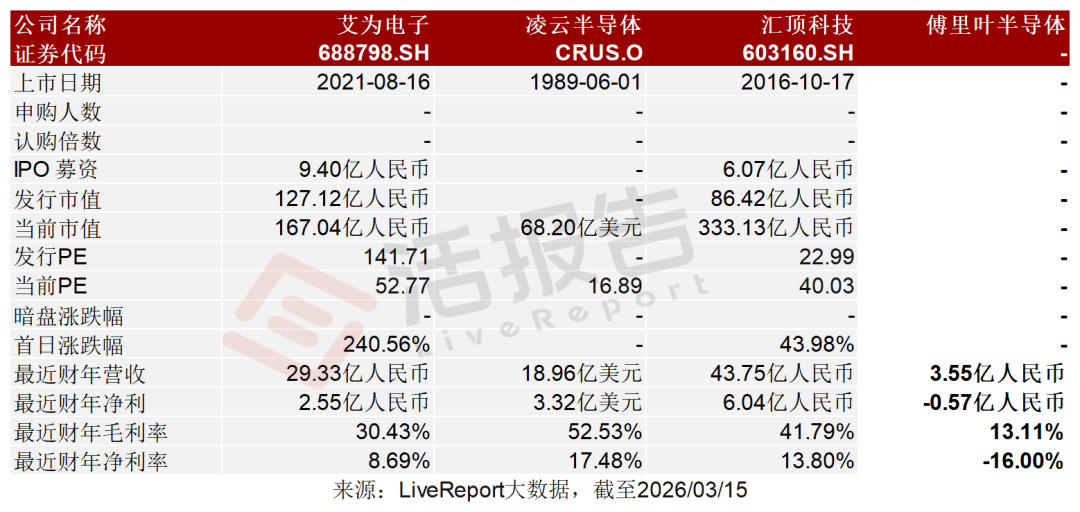 公司于2017年推出中國首款集成ASIC DSP的便攜式功放音頻芯片,于2021年推出中國首款中大功率音頻芯片,及于2023年推出中國首款通過車規級AEC-Q100認證的功放音頻芯片。公司的產品包括(1)低功率音頻芯片,包括兩大類型,即自適應功率控制音頻芯片及便攜式功放音頻芯片;(2)中大功率音頻芯片;(3)觸覺反饋芯片;及(4)其他,包括電源管理芯片。根據弗若斯特沙利文報告,于2024年,公司在中國交付逾4億顆功放音頻芯片,并在全球交付逾4.5億顆功放音頻芯片。公司的收入主要來自低功率音頻芯片,該板塊收入占比始終保持在90%以上,其中自適應功率控制音頻芯片和便攜式功放音頻芯片是核心細分品類。從下游應用來看,手機是最大收入來源,平板電腦、智能手表等消費電子領域亦有顯著貢獻,汽車等新興領域收入占比仍較低。截至2024年12月31日止3個年度、2024年及2025年前10個月:收入分別約為人民幣1.30億、1.50億、3.55億、2.89億、2.81億,2025年前10月同比-2.79%;毛利分別約為人民幣0.09億、0.00億、0.47億、0.39億、0.56億,2025年前10月同比+44.40%;研發分別約為人民幣-0.49億、-0.59億、-0.68億、-0.55億、-0.56億,2025年前10月同比+1.01%;凈利分別約為人民幣-0.66億、-0.94億、-0.57億、-0.47億、-0.52億,2025年前10月同比+10.45%;毛利率分別約為7.27%、-0.08%、13.11%、13.44%、19.96%;研發費用率分別約為37.37%、39.44%、19.16%、19.09%、19.83%;凈利率分別約為-50.57%、-62.63%、-16.00%、-16.23%、-18.44%。過去兩年及截至2025年10月31日止十個月,公司的收入總體呈增長后趨穩態勢,毛利同步改善,研發投入持續加大,凈利潤仍處于虧損狀態,但虧損幅度有所波動。截至2025年10月30日,公司經營活動現金流為-0.57億元人民幣,期末現金約為0.73億元人民幣。據弗若斯特沙利文(Frost & Sullivan)的資料,以總營收計,全球功放音頻芯片市場規模已由2020年的53億人民幣增長至2024年的89億人民幣,期間CAGR達13.6%,預計到2029年全球功放音頻芯片市場規模將達到204億人民幣,CAGR為18.1%。2024年,全球功放音頻芯片出貨量約50.0億顆,其中公司全年實現全球功放音頻芯片出貨量4.6億顆,約占全球市場份額的9.2%,在全球功放音頻芯片企業中排名第三,占據領先地位。按收益計,公司占全球市場份額約3.9%,在全球功放音頻芯片公司中排名第四。中國觸覺反饋芯片市場規模已由2020年的人民幣69億元增長至2024年的人民幣98億元,復合年增長率為9.0%。預計市場規模將于2025年達到人民幣114億元,并以17.0%的復合年增長率增長,到2029年達到人民幣214億元。公司在2024年實現中國觸覺反饋芯片出貨量580萬顆,約占市場份額的1.9%,在中國觸覺反饋芯片企業中排名第四。同行業IPO可比公司:艾為電子(688798.SH)、凌云半導體(CRUS.O)、匯頂科技(603160.SH)公司的董事會由九名董事組成,包括四名執行董事、兩名非執行董事及三名獨立非執行董事。徐小林先生及其控制的持股平臺,合計持股32.76%,連同一致行動人劉保良先生持股2.52%,合計持股約35.28%;公司上市前經歷了多輪融資。在2022年8月的D輪最新融資中,公司的投后估值約為27.75億人民幣。據LiveReport大數據統計,傅里葉半導體中介團隊共計10家,其中保薦人2家,近10家保薦項目數據表現尚可;公司律師共計4家,綜合項目數據表現不一。整體而言中介團隊歷史數據表現一般。
