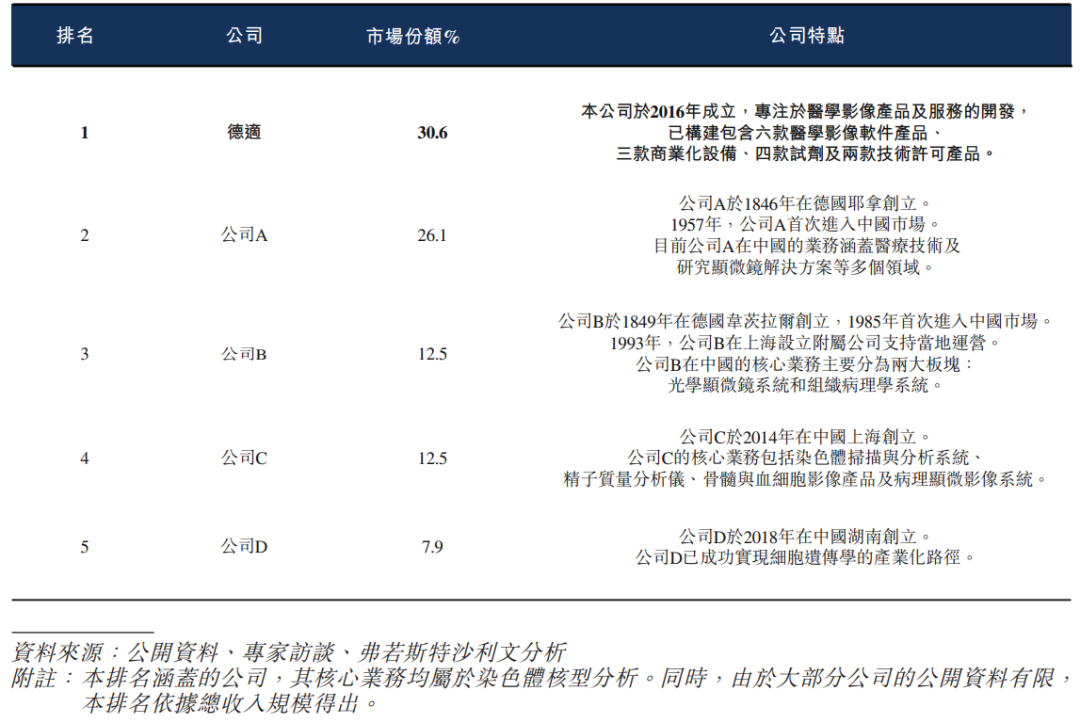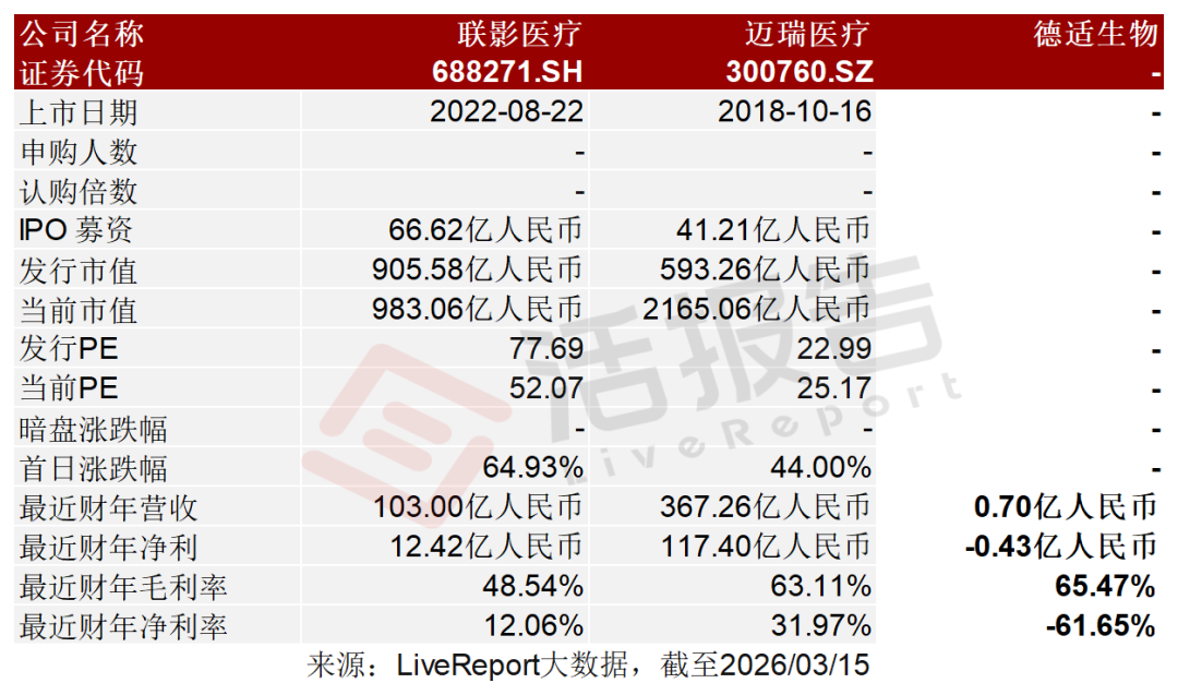 2026年3月15日,德適生物-B通過港交所聆訊,擬在香港主板上市,獨家保薦人為華泰國際。公司是專注于開發醫學影像產品及服務的醫療器械公司,2024年收入0.70億元人民幣,同比增長33.13%,凈虧損0.43億元,毛利率65.47%;2025年前9個月收入1.12億元,同比增長469.82%,凈虧損0.37億元,毛利率75.86%。LiveReport獲悉,杭州德適生物科技股份有限公司Hangzhou Diagens Biotechnology Co., Ltd.(簡稱“德適生物-B”)于2026年3月15日通過港交所聆訊,擬在香港主板上市。該公司此前于2026年1月6日遞表。公司成立于2016年,是一家專注于開發醫學影像產品及服務的醫療器械公司。公司已開發出多元化的產品組合,可有效提升診斷效率及服務質量,包括:六款醫學影像軟件產品,包括注冊階段核心產品AI AutoVision®、一款商業化產品AutoVision®,以及四款臨床前階段候選產品;核心產品AI AutoVision®是一款染色體核型輔助診斷軟件,專為執行染色體核型智能分析而設計,公司計劃在中國及全球范圍內通過提供預裝軟件的定制計算機銷售該軟件。采用外周血樣本進行輔助生殖診斷的染色體核型分析。其擬獲準用于出生缺陷預防、婚前及孕前篩查及輔助生殖等領域。AI AutoVision®于2025年5月獲國家藥監局認定為“三類創新醫療器械”,可享受加速監管審批流程(綠色通道)。自開展綠色通道審批以來,已有超過十款輔助診斷軟件產品作為創新醫療器械獲準進入綠色通道,其中尚無產品出現批準駁回或注冊失敗的情況。截至2024年12月31日止2個年度、2024年及2025年前9個月:收入分別約為人民幣0.53億、0.70億、0.20億、1.12億,2025年前9個月同比+469.82%;毛利分別約為人民幣0.37億、0.46億、0.08億、0.85億,2025年前9個月同比+908.44%;凈利分別約為人民幣-0.56億、-0.43億、-0.51億、-0.37億,2025年前9個月同比-27.87%;毛利率分別約為70.95%、65.47%、42.86%、75.86%;凈利率分別約為-106.19%、-61.65%、-259.39%、-32.83%。公司過去兩年收入與毛利穩步增長,凈虧損持續收窄。整體經營狀況逐步改善,盈利能力持續優化。公司的收入主要來自醫學影像軟件及醫療設備銷售,這是收入的重大部分,2023年該板塊收入占比達83.1%。截至2025年9月30日,公司經營活動現金流為-0.22億元人民幣,期末現金約為0.40億元人民幣。據弗若斯特沙利文(Frost & Sullivan)的資料,中國染色體核型分析系統市場在2019年(人民幣1.199億元)至2024年(人民幣1.659億元)期間保持穩定增長,復合年增長率為6.7%。預計到2024年至2030年,市場將進入快速擴張周期,到2030年將達到人民幣20.379億元,復合年增長率大幅提升至51.9%。按2024年的收入計,中國染色體核型分析系統市場前五大參與者合計占據約89.6%的市場份額。公司在市場排名第一,市場份額為30.6%。同行業IPO可比公司:聯影醫療(688271.SH)、邁瑞醫療(300760.SZ)公司的董事會由八名董事組成,包括兩名執行董事、三名非執行董事及三名獨立非執行董事。宋寧博士直接持股約30.04%;由宋寧博士均擔任其普通合伙人進行管理的德適諾輝持股約9.42%、德適諾達持股約5.88%、德仟科技持股約4.37%、德適諾鑫持股約2.35%;其余股東包括:杭州紫洲持股約5.80%;和途六號持股約5.55%;寧波嘉緣持股約4.33%;國中投資持股約3.66%;力遠健鯤持股約3.66%;杭州紫城持股約3.14%;杭州和馥持股約2.66%;濱海遠翼和天津遠翼各持股約2.40%。公司上市前經歷了多輪融資。在2025年6月的最新融資中,公司的投后估值約為25.6億人民幣。據LiveReport大數據統計,德適生物-B中介團隊共計8家,其中保薦人1家,近10家保薦項目數據表現尚可;公司律師共計1家,綜合項目數據表現有待加強。整體而言中介團隊歷史數據表現中規中矩。(本文首發于活報告公眾號,ID:livereport)