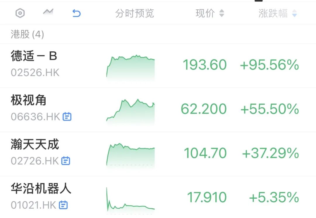 其中4只新股已進行暗盤交易,并全部錄得上漲,德適-B輝立暗盤漲95.56%,極視角輝立暗盤漲55.5%,瀚天天成輝立暗盤漲37.29%,熱度最高的華沿機器人輝立暗盤漲幅最小,僅漲5.35%。