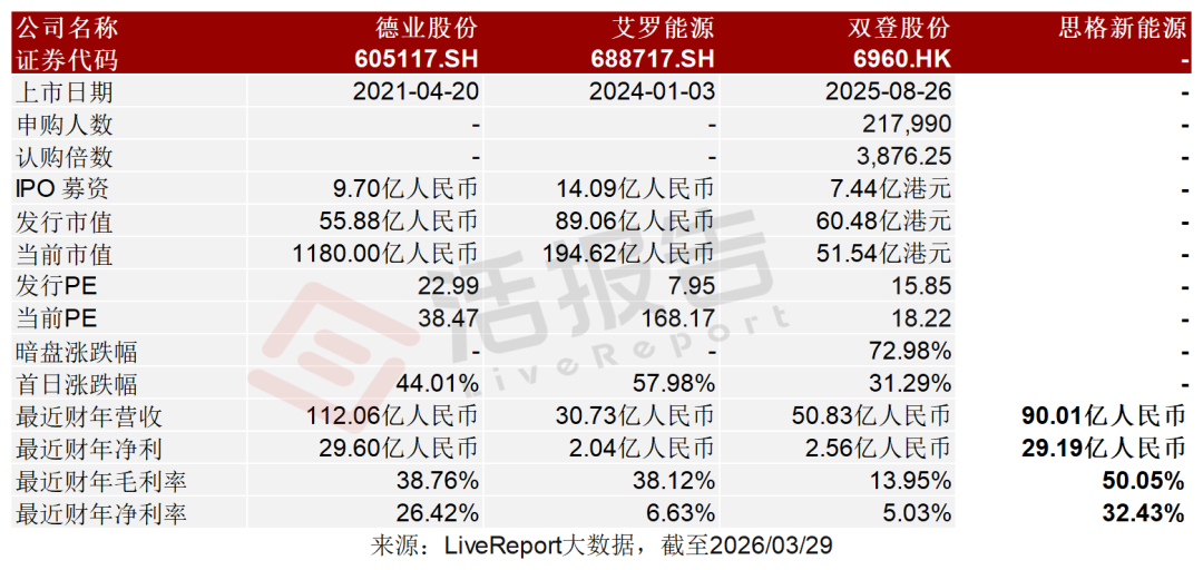 2026年3月29日,思格新能源通過港交所聆訊,擬在香港主板上市,聯席保薦人為中信證券、法國巴黎銀行。公司是分布式儲能系統(DESS)解決方案領域的全球領先者,2024年收入13.30億元,同比增長2185.95%,凈利潤0.84億元,同比扭虧為盈,毛利率46.90%;2025年收入90.01億元,同比增長576.81%,凈利潤29.19億元,同比增長3381.22%,毛利率50.05%。