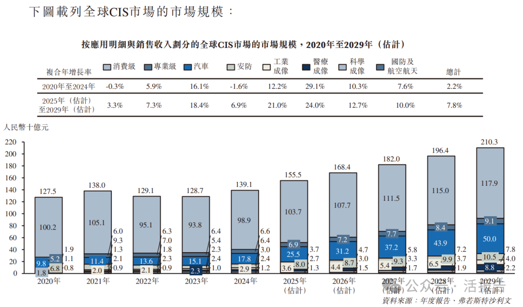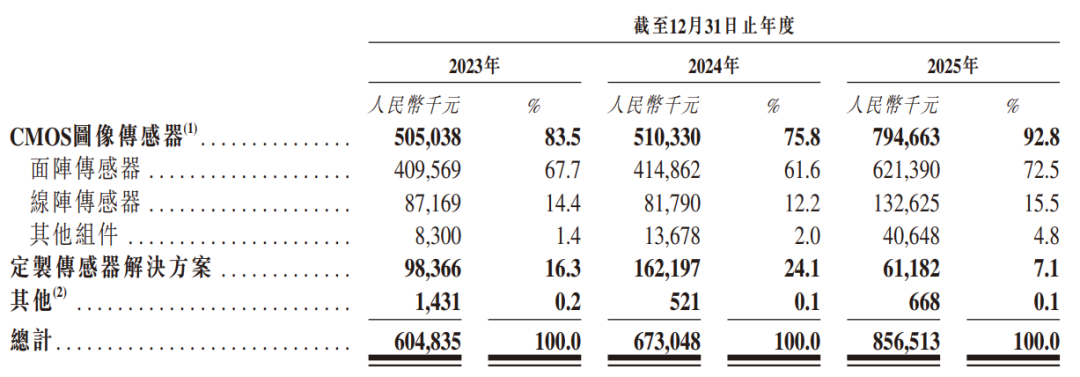 公司是CMOS圖像傳感器(CIS)提供商,專注于高性能CMOS圖像傳感器的研發,提供的九大產品系列,廣泛適用于工業成像、科學成像、專業影像和醫療成像等先進技術領域。公司于2015年成功研發世界上第一款BSI、sCMOS圖像傳感器,截至目前,公司目前已掌握11項專有核心技術,包括全局快門像素、HDR像素、高靈敏度像素、HDR讀出電路、低噪聲電路、高性能ADC電路、高速讀出電路、TDI圖像傳感器、BSI圖像傳感器、3D成像傳感器及3D晶圓堆棧。該等技術在CMOS圖像傳感器的像素設計、電路設計和工藝開發方面建立起強大的技術壁壘。于2024年按工業成像收入計,公司在全球CIS公司中排名第三,在中國CIS公司中排名第一,占全球市場份額的15.2%;于2024年按科學成像收入計,公司在全球CIS公司中排名第三,在中國CIS公司中排名第一,占全球市場份額的16.3%。公司以無晶圓廠的業務模式運營,公司以傳感器設計為業務核心,設計完成后交付第三方晶圓代工廠進行生產制造,并由公司自主進行晶圓測試,后交由第三方封裝廠進行封裝(公司已逐步承接部分封裝產能),在封裝完成后公司自主進行最終測試。公司的高性能CMOS圖像傳感器可以按像素排列分為(i)面陣傳感器及(ii)線陣傳感器。面陣傳感器的像素排列呈二維矩陣,使其能夠在一次曝光中捕集完整的二維圖像。相比之下,線陣傳感器的像素排列呈直線,并通過掃描與傳感器方向垂直、并以恒定速度移動的物體來捕集二維圖像。收入分別約為人民幣6.05億、6.73億、8.57億,2025年同比+27.26%;