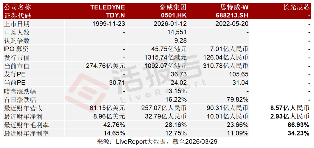 2026年3月29日,長光辰芯通過港交所聆訊,擬在香港主板上市,聯席保薦人為中信證券、國泰海通。公司曾于2023年6月提交A股科創板上市申請,但經綜合考慮多項因素后于2025年1月主動撤回。公司是CMOS圖像傳感器(CIS)提供商,2024年收入6.73億元,凈利潤1.97億元,毛利率58.96%;2025年收入8.57億元,凈利潤2.93億元,同比增長48.82%,毛利率66.93%。