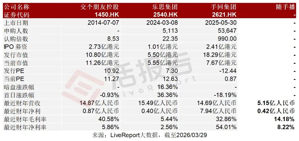 2026年3月27日,隨手播第2次向港交所遞交招股書,擬在香港主板上市,獨家保薦人為平安證券。公司是一家位于中國廣州的綜合解決方案提供商,2024年收入0.99億元,凈利潤0.38億元,毛利率50.82%。2025年收入5.15億元,凈利潤0.42億元,毛利率14.18%。報告期內,公司業績波動較大。公司是一家位于中國廣州的綜合解決方案提供商,專注于向(i)娛樂及社交網絡直播、(ii)精準營銷及(iii)零售行業的客戶提供綜合SaaS解決方案。公司于中國的企業直播SaaS解決方案市場中排名第十,按二零二五年收益計,市場份額為0.8%。公司的SaaS解決方案業務的兩個主要范圍包括軟件開發服務和技術支持服務,并策略性地服務于三個關鍵業務板塊:(i)娛樂及社交網絡直播,促進一對多的才藝展示和互動,以及實時的一對一音視頻連接;(ii)精準營銷,主要為B2B公司進行廣告流量分析、成效評估、制定營銷策略及優化;(iii)零售,支持品牌擁有人和客戶之間的合作直播營銷活動。作為SaaS解決方案業務的配套,公司自二零二四年六月起已擴大產品供應,提供在線營銷解決方案服務,包括制定度身訂制的營銷方案、設計制作廣告素材、廣告投放及獲取在線流量,以及廣告投放效果監測分析等配套服務。收入分別約為人民幣0.51億、0.99億、5.15億,2025年同比+420.38%;毛利分別約為人民幣0.42億、0.50億、0.73億,2025年同比+45.19%;凈利分別約為人民幣0.26億、0.38億、0.42億,2025年同比+10.98%;毛利率分別約為82.14%、50.82%、14.18%;凈利率分別約為52.20%、38.54%、8.22%。截至2025年12月31日,公司賬上現金約0.59億元,應收賬款約0.99億元。2025年經營現金流約0.46億元。交個朋友控股(1450.HK)、樂思集團(2540.HK)、手回集團(2621.HK)公司董事會由六名董事組成,包括三名執行董事及三名獨立非執行董事。孔曉明先生通過環豐持股約84.77%,孔曉明先生及環豐被視為一組控股股東;吳樹鑌先生通過GlittenDay持股約4.23%;據LiveReport大數據統計,隨手播中介團隊共計9家,其中保薦人1家,近10家保薦項目數據表現平平;公司律師共計3家,綜合項目數據表現普通。整體而言中介團隊歷史數據表現缺乏亮點。(本文首發于活報告公眾號,ID:livereport)